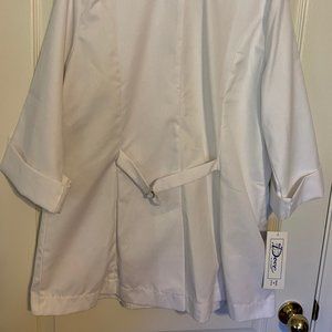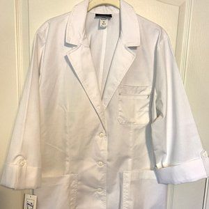 Lab coat fabric65% polyester, 35% cotton. Sleeves have a roll up tab. Made in USA