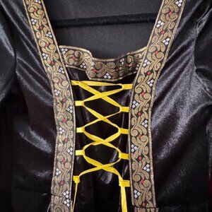 Beautiful black Renaissance style dress with beautiful gold detailing and yellow lace up front & bell sleeves. Perfect for the Renaissance Faire or a Party. Size medium.