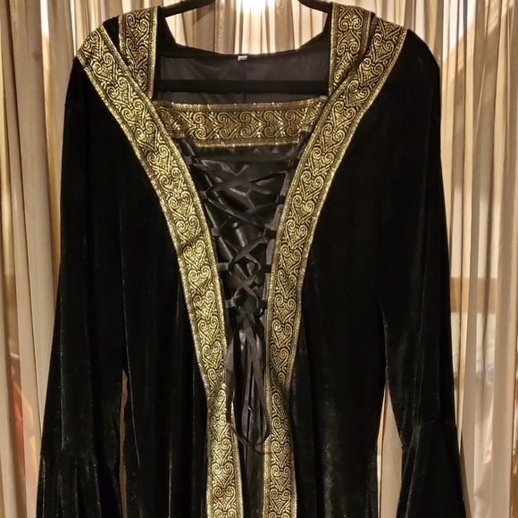 Black with gold trim, wide flowing sleeves. Full length dress. I'm 5'9" and dress goes to floor. Worn once for Halloween.