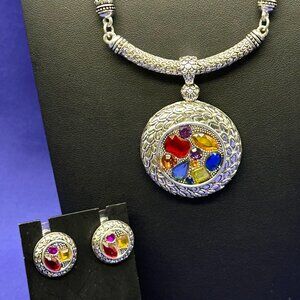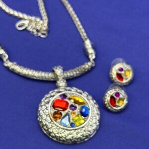 Medieval Style Jewel Tone Rhinestone Pendant Necklace & Matching Post Earrings