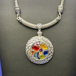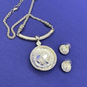Beautiful medieval style pendant necklace featuring jewel tone rhinestones set in a round silver-tone pendant with “dragon scale” designs around the outside. Pendant hangs from a unique “scale” style chain adorned with “dragon scale” designs and a wheat chain. The chain measures 17”-20” adjustable with 3” extender and lobster claw closure. Disc pendant measures approx. 1 ½” diameter. The matching post earrings measure approx. ¾” diameter. All pieces in very good pre-owned condition.