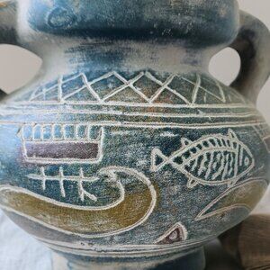 A rustic, hand-formed earthenware jar with a chalky blue wash and sgraffito carving—boats, fish, waves, and net patterns wrap the belly for a storybook seaside look. The small spout-like lip and twin handles nod to traditional Mediterranean forms while keeping the scale perfect for shelves and nightstands display.