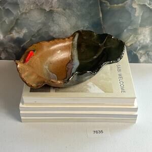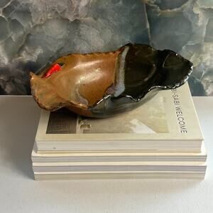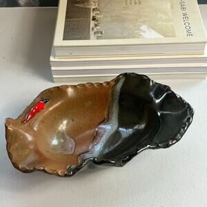 This medium 10" abstract art studio pottery bowl features a crimped wavy rim in brown earth tones. Handmade from clay using art pottery techniques, this round bowl is decorated with hand-painted, glossy finishes. With an art deco style and abstract asymmetrical pattern, it is perfect for all occasions and can add a touch of natural and decorative flair to any home. The bowl is one-of-a-kind, vintage in style, and weighs 1.4 lb, making it a unique and eye-catching piece for any space.