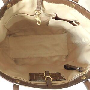 Amazing medium army green camouflage signature "C" Coach handbag tote. Features greens, browns, beiges, and white to match almost anything! Love this bag!! Stitched brown leather handles, accents, edging, and bottom. Two pockets on one side and one large, zippered pocket on the other side. Stitched leather closure. Beautiful beige signature inside fabric in great condition as shown. Measurements are 12" L x 9.5" H x 4.5" W (bag only - without handles)