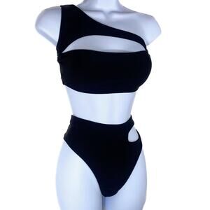 Medium Asymmetrical Cutout Black Bikini Swimsuit Set Padded Bandeau Shoulder
