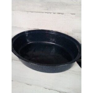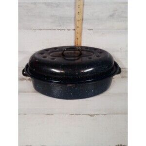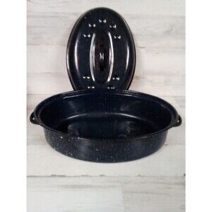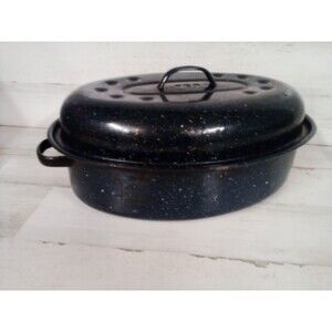 The Medium Blue Roaster Pan is a versatile kitchen essential that is perfect for all occasions. This electric stove compatible pan features a stylish blue color, adding a touch of elegance to your cooking space. Although it may have some wear and tear, this roaster pan is still functional and ready to cook up delicious meals for you and your family.