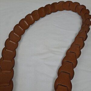 Multiple pieces of leather are connected together for the bulk of this belt. Solid leather pieces at the ends. Brass toned metal buckle. Very minor wear.