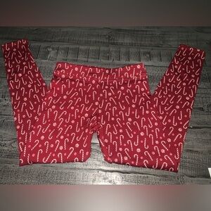 Festive red leggings with a playful candy cane print. Perfect for holiday fun and comfort.