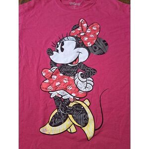 Good Used Condition Women's Size Medium 8/10 Disney Minnie Mouse Short Sleeve Crew Neck Pink with Red, Black, White, Grey, and Yellow Tee T-shirt Top