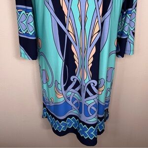Medium Dressbarn Blue Boho Dress Gold Chain Neckline Stretch Geometric