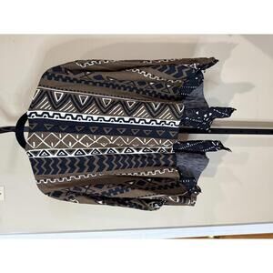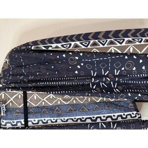 Patterned with geometric shapes in black, brown, white, and blue tones.