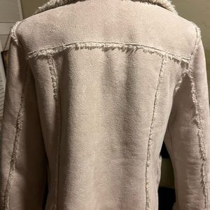 I don’t know the brand name or the material the tag is gone. But it’s imperfect condition. It’s a gorgeous, soft and ready for its new home. It was gently used a few times. It is beautiful, dressed up or dressed down. This cream color jacket goes with so manyof your favorite outfits take advantage of the low price today