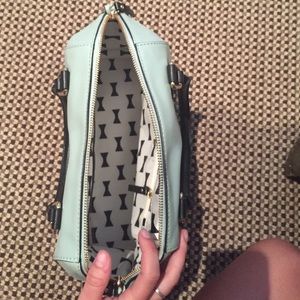 Mint color with black handles, one large zip up pocket with small side pockets, good condition barely used