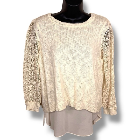 Medium Lucky Brand Ivory Cream Knit Chiffon Top Embroidered Lace Pullover
