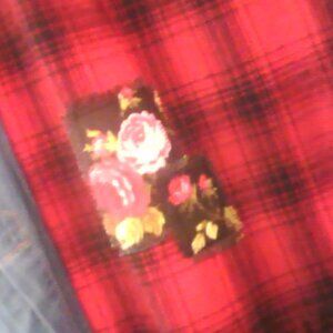 This DUSTER is upcycled from a MEDIUM lady's denim western snap shirt. The skirting is made up of a black and red flannel and a black and red floral cotton. Patchwork has been added to the front and center back. Length from top of shoulder 48". Open below denim bodice. CAN BE WORN OPEN OR CLOSED!