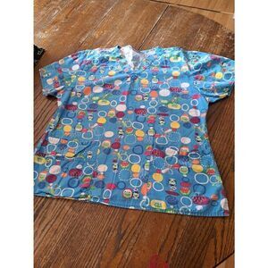 Good Used Condition ESTIMATED Women's Size Medium (Please See Measurements) V-Neck V-Cut Short Sleeve Pullover Scrub Top Shirt with Pockets- Multi Color Frogs, Flowers, Floral - Nurses, Veterinarian Tech, Medical Worker, Casual Wear- Blue, Yellow, Pink, White, Purple, Green, Orange