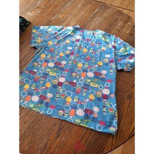 Medium Multi Color Frogs and Flowers Floral Short Sleeve VNeck Scrub Top Shirt