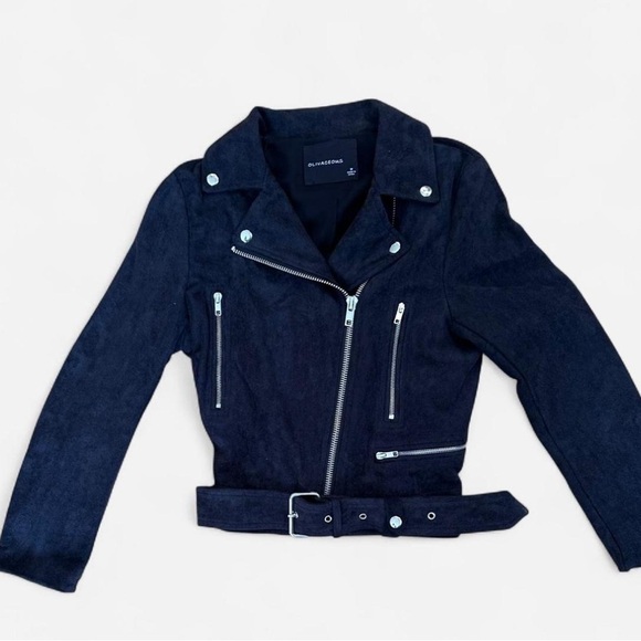 Medium Olivaceous Women’s Moto Jacket Style faux Suede Black Zippers Pockets