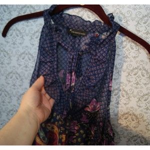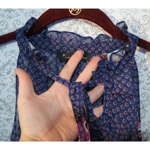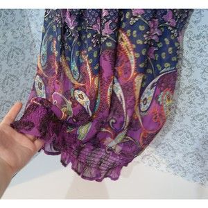 This ruffled sheer top is so pretty! The tie neck with the ruffles is a nice delicate detail. The purple and blue with the paisley and flowers makes this such a lovely top. Would look great over a pretty bralette, bra or tank top.