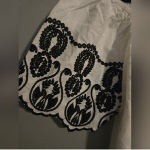 Can be worn on or off the shoulder. If you need measurements please ask. Stylish off-shoulder white blouse featuring elegant black embroidery on the sleeves. Ideal for both casual and work settings.