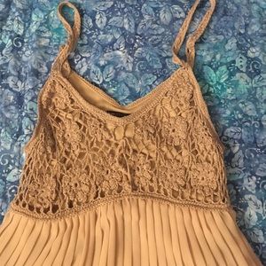 Medium Teen Vogue Tan Pleated and Crotched dress. Perfect for Weddings in the summer!