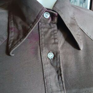 This vintage western shirt exudes the charm of the 1970s era, showcasing a pointed collar and chocolate brown shade. A timeless piece for collectors.