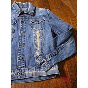 Good Used Condition Men's Size Medium Vintage Carbon 2005 Distressed Destroyed Long Sleeve Button Front Denim Blue Jean Jacket