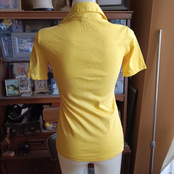 This vintage yellow polo shirt by Jugs features a classic collared design with button closures. Unique for its era, it exudes retro charm and comfort.