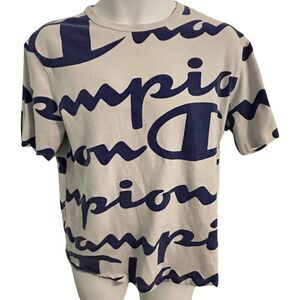 Medium Vintage Champion All Over Logo T-Shirt Short Sleeve Blue White Summer Pool Beach Vacation Casual Relax Athletic Athleisure