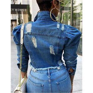 Medium Wash Blue Denim Jacket Puff Sleeve Distressed Blue Denim Cropped Jacket