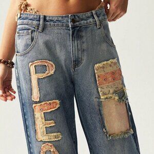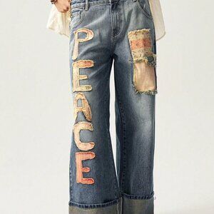 Medium Wash Casual Women's Distressed Letter Patch Loose Fit Denim Jeans