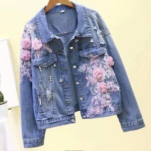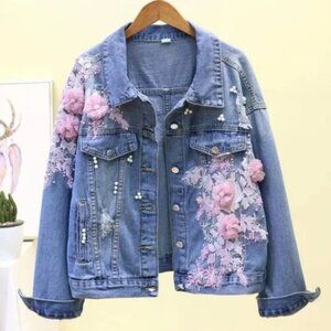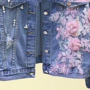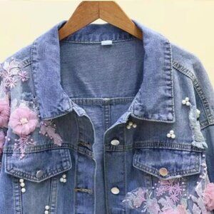Medium Wash Distressed Floral Applique Faux Pearl Jean Jacket