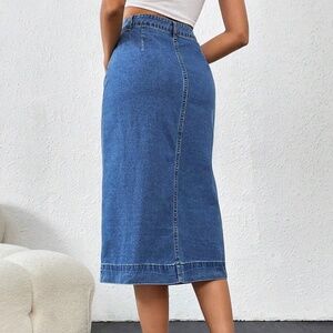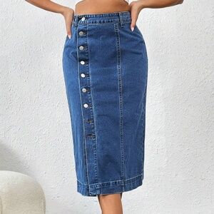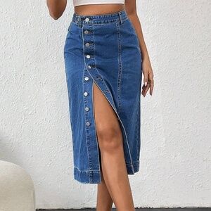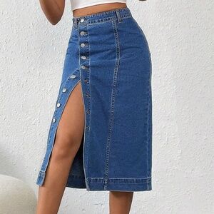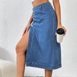 Medium Wash High Waisted Button Slit Midi Skirt