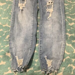 Numerous holes and rips on knees, thighs, and ankles, fits slightly loose.