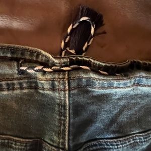 I believe these are meant to be cropped but I am very short (5’2”) so they hit at the ankle like a normal pant would. Adjustable drawstring waist with blue and white tassel string adds a little boho touch and makes them a bit more adjustable than a typical button closure. Tags were preemptively taken off but they have never been worn and are in new condition. Features a raw hem.