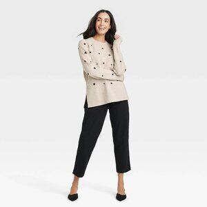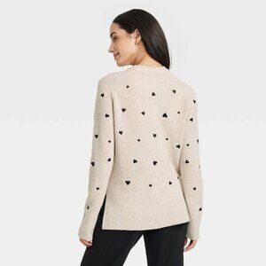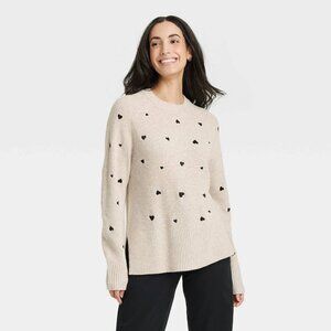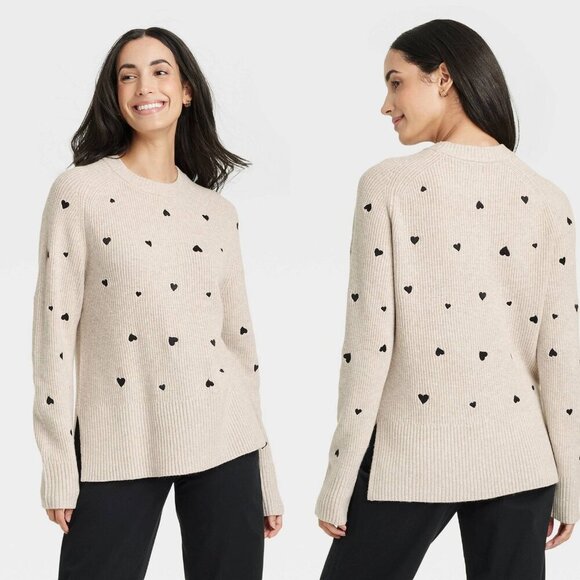 Make a style statement on cool-weather days with this Heart Crewneck Pullover Sweater from ANewDay. The midweight recycled polyester-blend fabric offers a comfortable fit, with a crewneck and side slits for ease of wear. A ribbed hem and cuffs offer a snug fit. Simply add bottoms, footwear and accessories of your choice to complete the look.