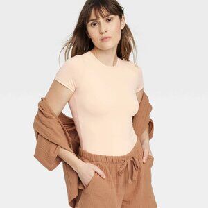 Medium - Womens Stretch Short Sleeve Bodysuit - Auden - Beige