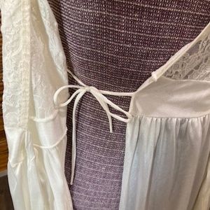 Vintage ivory dressing robe by Cinema Etoile. Feel glamorous wearing this over your stays while you do your hair and makeup and pick your outfit for the day. Pretty shoulder appliqué and flutter sleeves. Has inner tie and some stretch for a nice fit. Nylon, machine wash and dry. Gently preowned