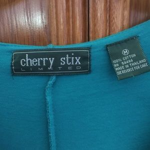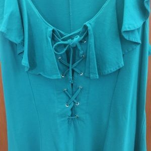 Cherry stix. Cotton. Lace up on chest. Medium size. Runs slightly big. Ruffled neckline. Teal.