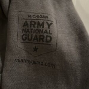 Medium gray hoodie sweatshirt, lightweight with army National Guard logo on sleeve American flag logo on chest. Good use condition. Model 6‘2“.