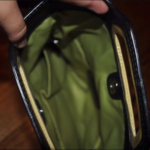 A perfect crossbody coach purse with the classic 'C' logo in black. It has a folded flap and on the back side there is a silver zipper. The interior is lime green and has rarely been used.