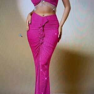 Twist Front Fringe Hem Crop Mesh Tube Top & Ruched Pencil. Skirt Fusha pink, rhinestone two-piece skit set. Brand new. tag still attached. Size medium for the top and the bottom. Skirt has rouching down the middle. kind of mermaid like.