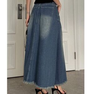 Medium wash High Waisted Frayed Hem Denim Jean Maxi Skirt