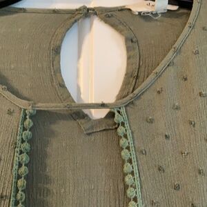 Size medium BoHo blouse. Open front with ties at the bottom & bell sleeves with crocheted detail. All my clothing is from smokefree/pet free home and like new condition (unless noted in description).