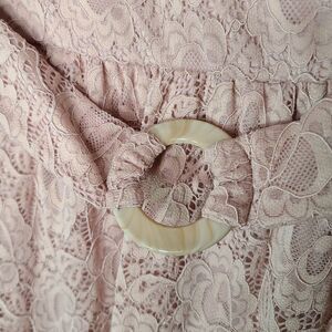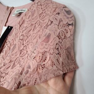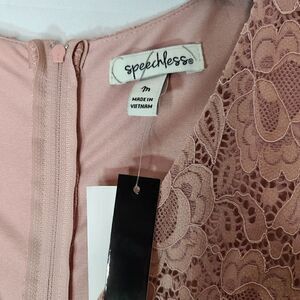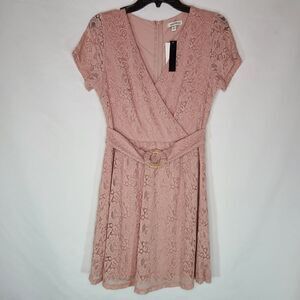 Medium Pink Lace Dress V neck Short sleeve lined , faux Belted front, zip up back, lightweight. NWT Speechless. Measurements for reference only approximately v neck 8" under arm to under arm 17" sleeve inseam 1" weight 11oz