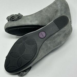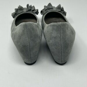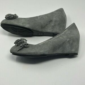 Brand new. Wedge heel with cushion so they’re very comfortable. Grey suede with a ruffled bow detail.