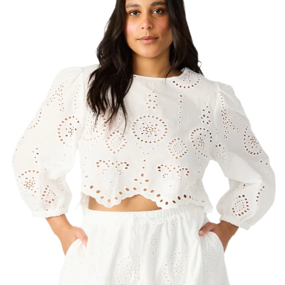 Elegant white eyelet top with intricate detailing. Perfect for a chic and stylish look.