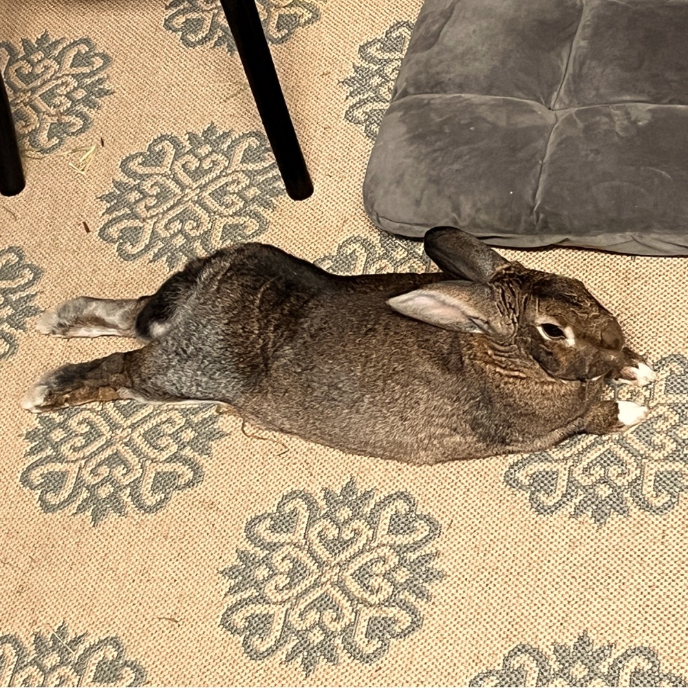 Max is our precious bunny! He doesn’t have a cage! He roams freely around the house just like a cat or dog! He is super clean and doesn’t smell!! We trained him to jump in and out of his litter box when he needs to do his business! He also comes when we yell “dinner time” or “snack time”!