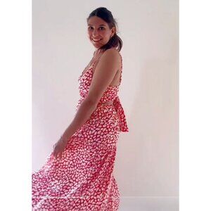 Meet me in Santorini Tiered Tie Back Maxi Dress Pink White Print Satin Resort XS