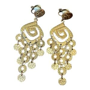 These bold vintage clip-on earrings are pure drama in the best way possible—swirling gold-tone spirals paired with cascading textured discs that dance with every move. They shimmer, they sway, and they command attention, making them the perfect statement piece for a night out or a glamorous vintage-inspired look.